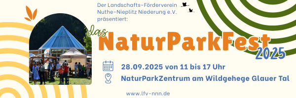 Am Sonntag, den 24. September, 11 – 17 Uhr laden die Naturparkverwaltung und der Landschafts-Förderverein Nuthe-Nieplitz-Niederung e.V. zum traditionellen NaturParkFest ans NaturParkZentrum am Wildgehege Glauer Tal ein. Die Besucher erwartet neben buntem Markttreiben mit regionalen Produkten und Kunsthandwerk auch ein vielfältiges Familienprogramm. Zurück zur Übersicht